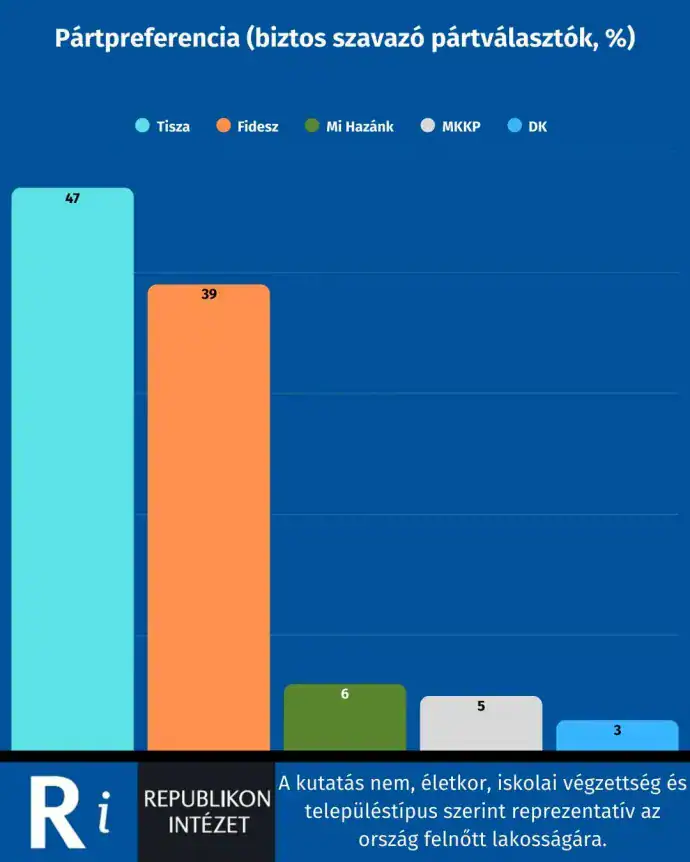 Republikon Intézet: A Tisza Párt 8 százalékponttal vezet a biztos szavazók körében